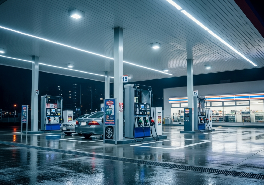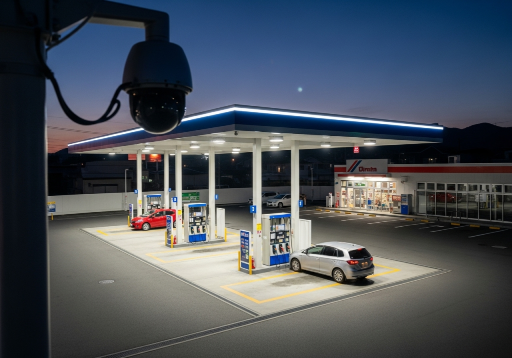 ガソリンスタンドは屋外施設のため、夜間の照明や天候の影響を強く受けます。